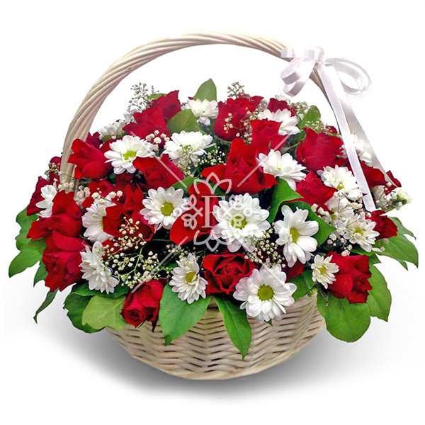 роза красная – 9 шт., хризантема кустовая ромашковидная белая – 3 тш., гипсофила, декоративная зелень, оазис, корзина, лента.