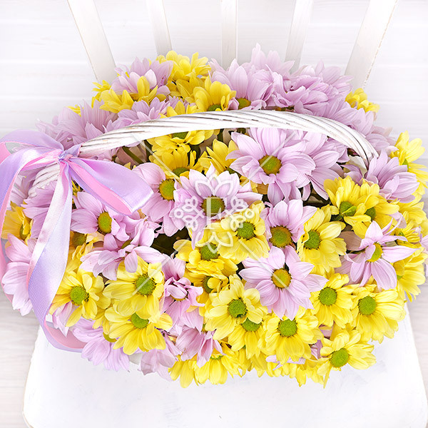 Хризантема желтая и сиреневая – 9 шт.,оазис, корзинка, лента.